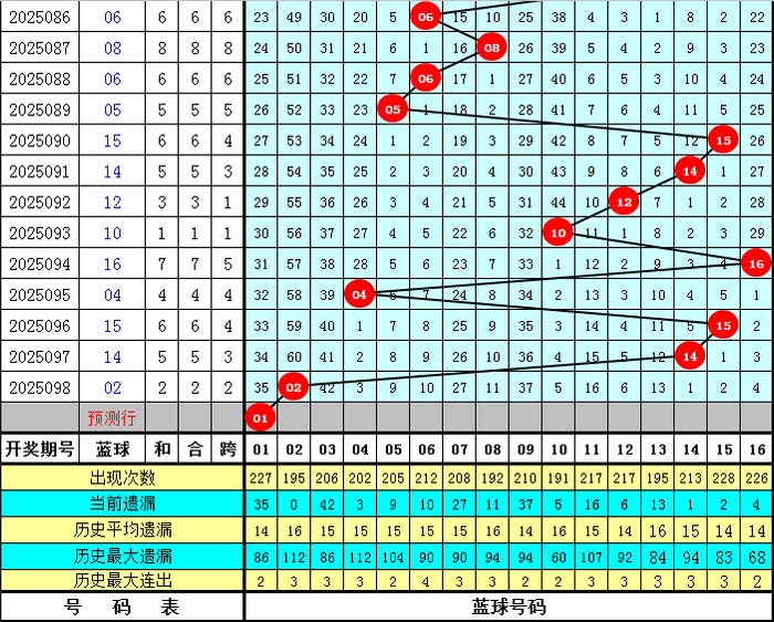 上期开出蓝球号码02,该号码在最近300期中出现了14次,其下期分别开出:蓝球16出现4次,蓝球11出现2次,蓝球04、06、07、09、10、13、14出现1次,蓝球01、02、03、05、08、12、15出现0次。本期五码蓝球参考01、03、12、13、14,独蓝关注01。