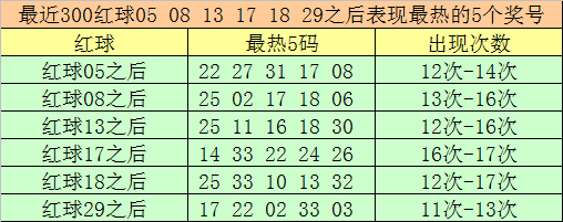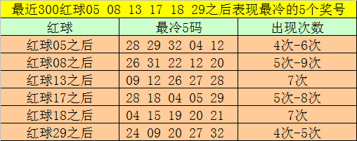 红球冷码统计:双色球第2025098期开出红球奖号分别为:05、08、13、17、18、29,在最近300期开奖中,各号码出现之后其下期出现最少的5个红球分别为: