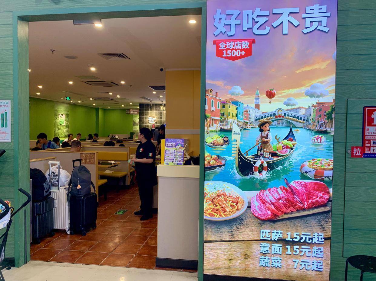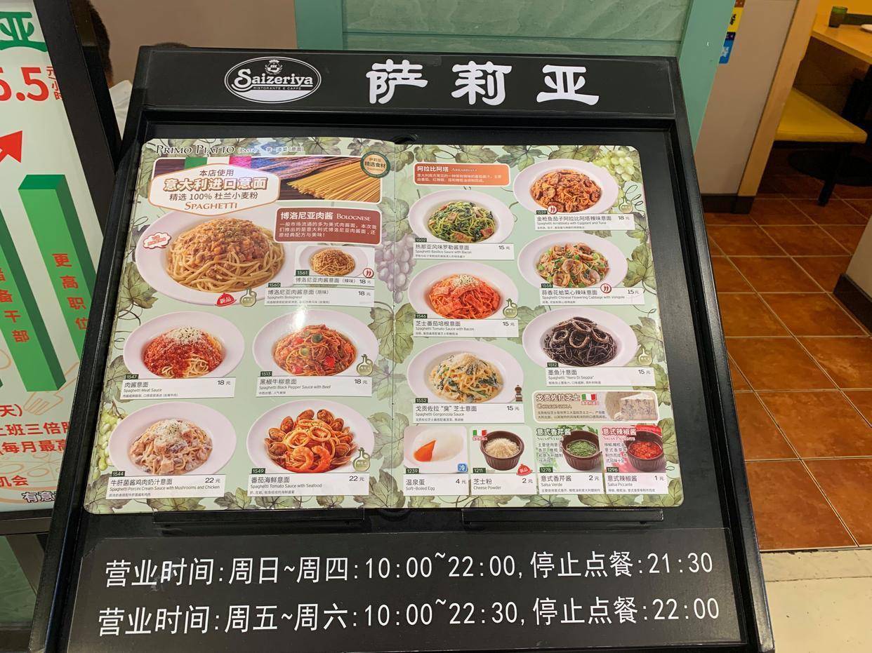 10月19日下午约5:30分,记者来到深圳龙华区上塘会商场一楼的萨莉亚门店内,看到上座率已达八成。披萨15元起,意面15元起,蔬菜7元起……门店门口一幅巨大广告牌上写着“好吃不贵”的字样,就餐人群中大多数是带着孩子的家长,以及部分年轻情侣。