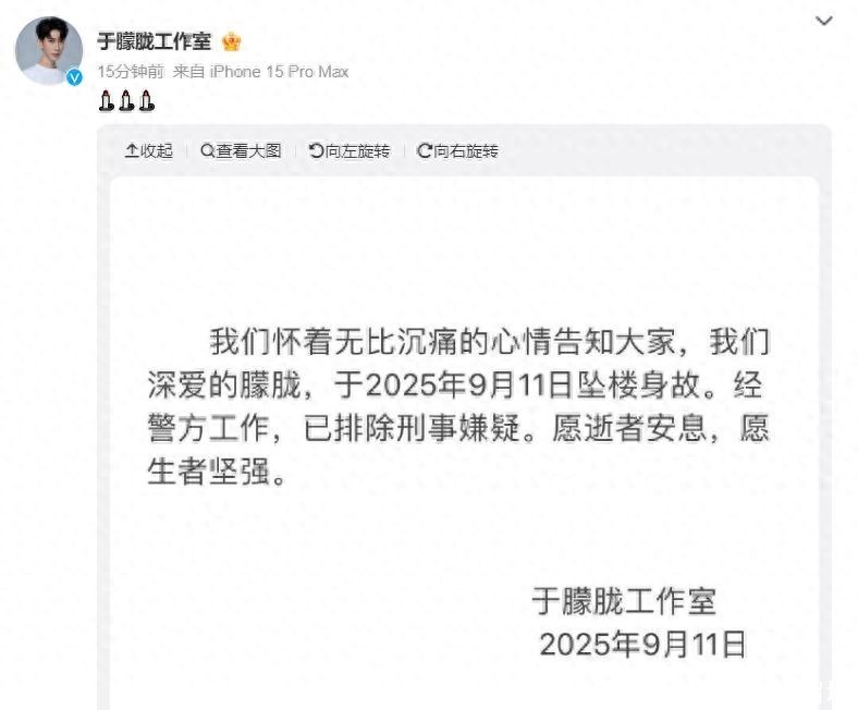 根据工作室的发文可知,于朦胧坠楼离世一事已经排除刑事嫌疑。