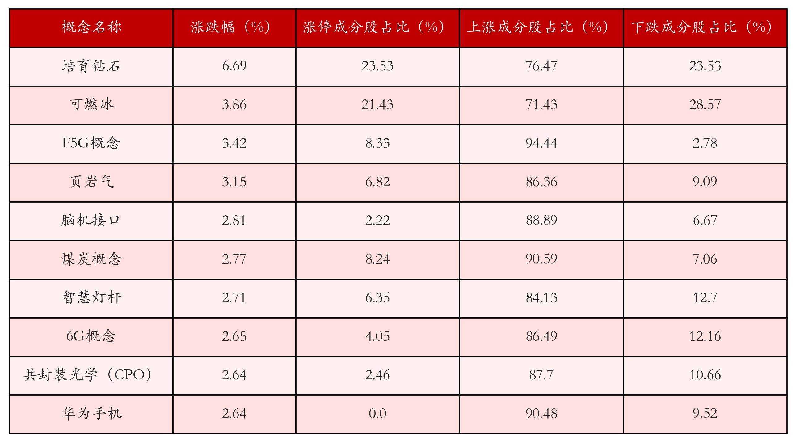 根据A股概念涨跌幅与所对应的股票池综合分析,涨幅靠前的三个概念板块分别为:培育钻石、可燃冰与F5G概念。排名前10位的概念板块相关数据见下表: