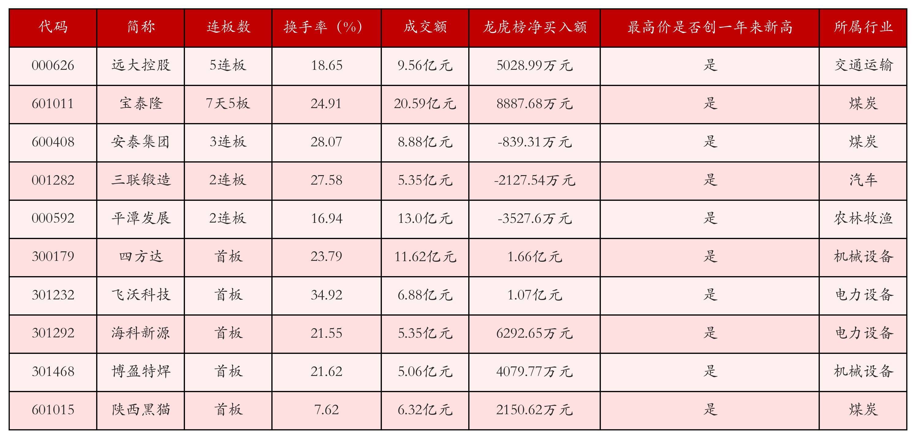 截至10月20日收盘,上证综指上涨0.63%,收于3863.89点,深证成指上涨0.98%,收于12813.21点,创业板指上涨1.98%,收于2993.45点。今日沪深两市A股共计95只涨停,综合当前连板数以及当日龙虎榜数据,其中较为强势的前三只个股分别为:远大控股(000626)、宝泰隆(601011)与安泰集团(600408)。今日强势个股前10位具体数据见下表: